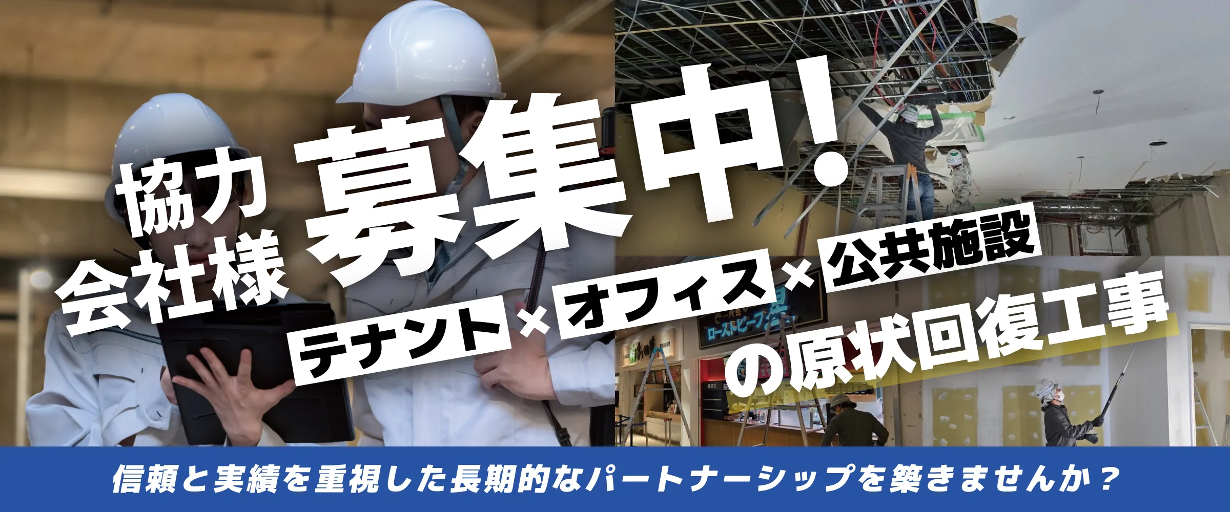 当社は、テナント・オフィス・公共施設専門の原状回復工事会社です。創業以来の経験と専門知識をもとに、安心・安全・一気通貫の施工をご提供。