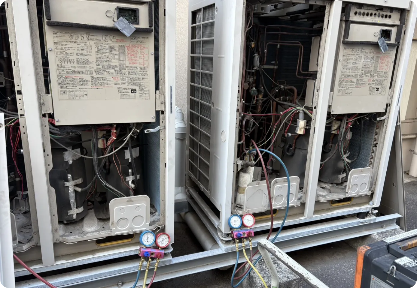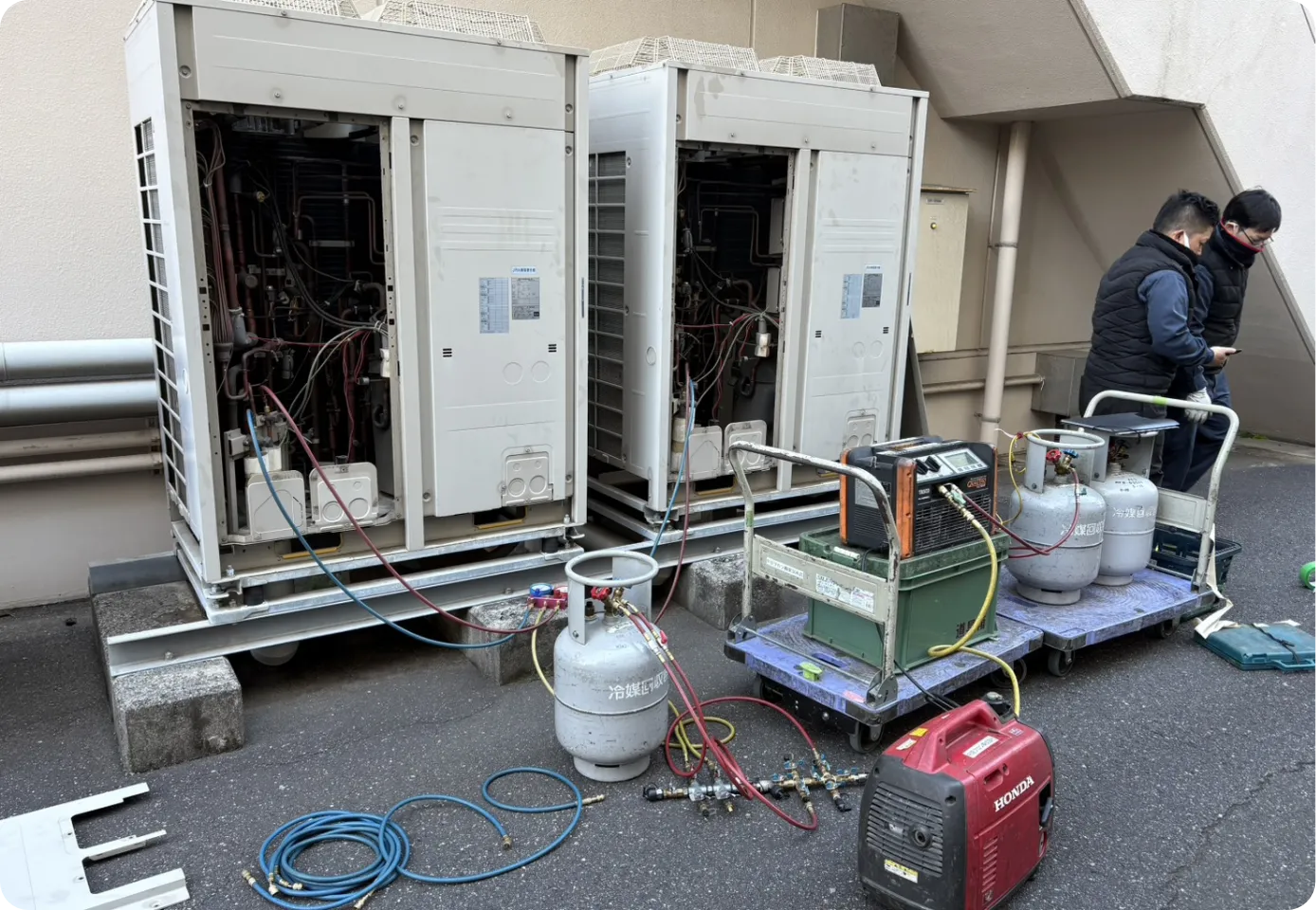 フロンガスの回収工事を実施しました。